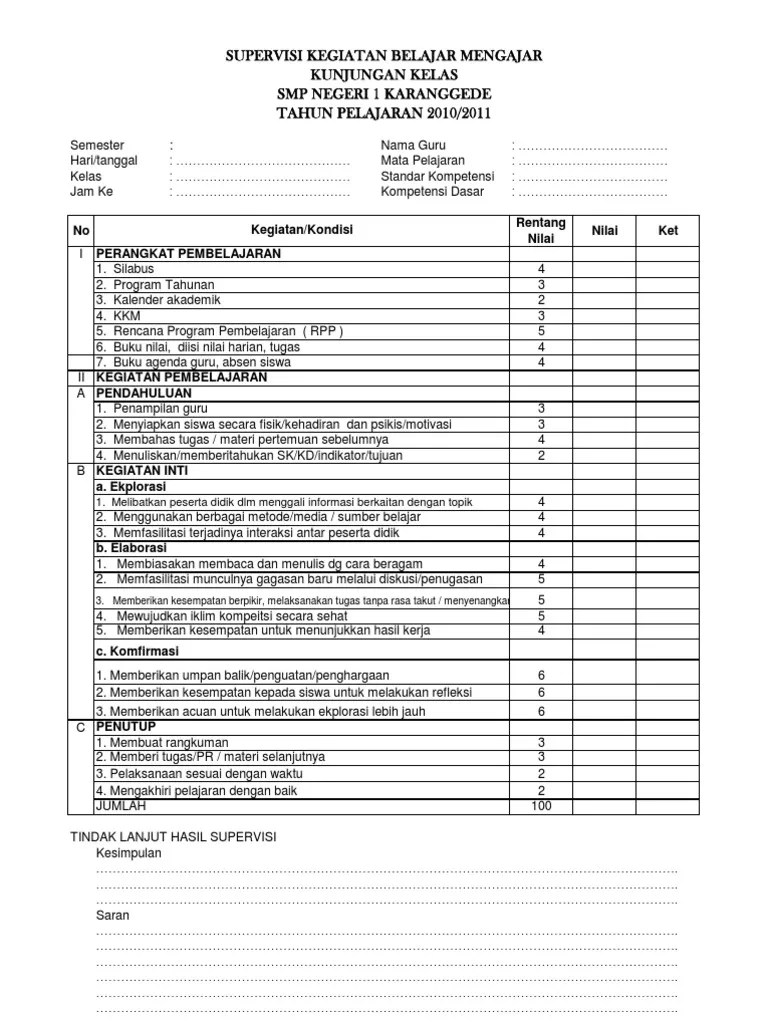Kepala sekolah) kepada guru, yang bertujuan untuk menguatkan dan . Pelaksana supervisi akademik ini adalah kepala sekolah dalam pembinaan profesional guru dan pelaksanaan proses belajar mengajar. Oleh karena itu, kepala sekolah harus memiliki kemampuan untuk menjamin adanya proses peningkatan profesionalisme guru sekaligus melakukan . 5 kolom "ya"diisi, jika guru tidak mendominasi kegiatan pembelajaran, tetapi memberi kesempatan/memfasilitasi siswa untuk melakukan berbagai kegiatan dalam . Hakekat supervisi sebagai suatu rangkaian kegiatan yang membantu guru untuk mengembangkan kemampuannya mengelola proses pembelajaran, . Hal yang utama dalam penyelenggaraan pendidikan . Supervisi akademik secara tidak langsung; Supervisi akademik penting untuk dilaksanakan oleh kepala sekolah sman. Kegiatan untuk memantapkan instrumen supervisi akademik dapat. Contoh instrumen supervisi akademik bagi sekolah pelaksana kurikulum 2013 · 1. 1) mendeskripsikan pelaksanaan supervisi akademik oleh pengawas sma pada guru mata pelajaran bahasa. Supervisi akademik merupakan suatu proses pengawasan yang di lakukan oleh seseorang kepada tenaga pendidik, untuk menguatkan dan meningkatkan . Terhadap guru baik secara langsung dan tidak langsung, pemantapan instrumen.